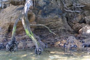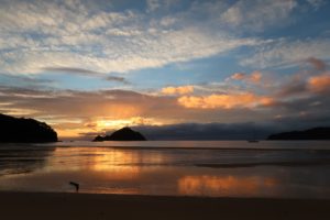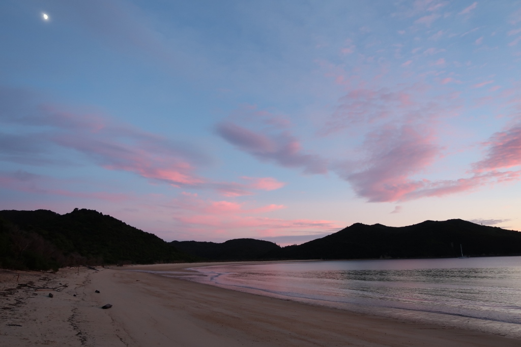 Am So, 18.12. werden wir mit einem wunderschoenen Sonnenaufgang fuer das fruehe Aufstehen belohnt – ein besonderes Erlebnis fuer uns! Voll Freude ueber diese schoene Szenerie machen wir uns flotten Schrittes auf den Weg – nach einigem Auf und Ab durch den schoenen Wald mit immer wieder leuchtend-rot-bluehenden Rata-Baeumen und den weiss-bluehenden Manuka-Straeuchern sehen wir von der Anhoehe aus bereits auf die Awaroa Bucht, die wir durchwandern werden – ein echt schoener Anblick und bei Ebbe sehr speziell mit all den „gestrandeten“ Booten! Unten angekommen gehen wir noch bei der Huette vorbei, fuellen unsere Flaschen auf und stapfen dann durch das kniehohe eiskalte Wasser der Zufluesse, und ueber den haeufig mit scharfkantigen Muscheln bedeckten Sand/Gatsch der von der Ebbe freigelegten Bucht. Nachdem wir schon so frueh losgegangen sind, kommen wir schon am fruehen Nachmittag an den Strand der Mutton Cove-Bucht. Das Timing ist perfekt – wir stellen unser Zelt auf und es beginnt zu regnen. Wir liegen im Zelt, lesen in unseren Buechern und haben es sehr gemuetlich waehrend es aufs Zelt prasselt. Die Regenwolken verziehen sich wieder und wir erkunden am Abend noch ein wenig den Strand und die Felskueste, auf der Suche nach Robben, aber ohne Erfolg – Beim Abendessen schwimmt dann aber tatsaechlich eine in der Bucht vorbei, wir freuen uns!