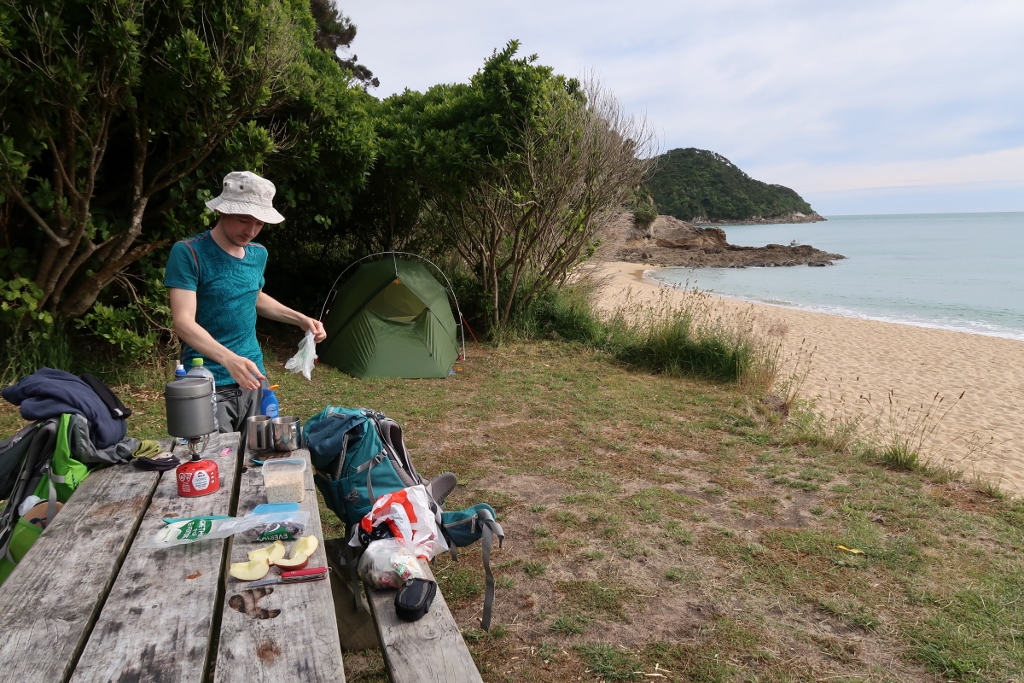 Der Track ist eine echte Genusswanderung und fuehrt – je nach Geschwindigkeit und Variante – in 3 bis 5 Tagen auf schoen-zu-gehenden Wegen entlang dem Meer bis zum Separations Point, dem noerdlichen Ende des Nationalparks. Am ersten Tag war der Campingplatz bei der Anchorage Bay unser Ziel. Auf diesem Abschnitt kommen uns viele Tages-Geher entgegen, die sich mit dem Wassertaxi nach Anchorage bringen lassen um dann zu Fuss zurueckzugehen. In der Abendsonne sind wir bei unserem einfachen Campingplatz angekommen und der Ausblick auf die Bucht, bevor man von der Anhoehe hinabsteigt, war traumhaft!