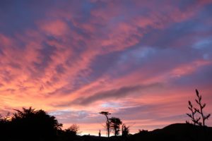 Der naechste Tag (Do, 22.12.) ist etwas wolkenverhangen und wir machen eine kleinere gemuetliche Wanderung, den Green Hill Walk. Wir wandern durch die gruenen Huegel mit den Schafherden und windzerzausten Baeumen. Nach einigen Regenschauern am Nachmittag (die wir gemuetlich vom Bett aus geniessen) lichtet sich am Abend der Himmel und wir erleben einen schoenen Sonnenuntergang.