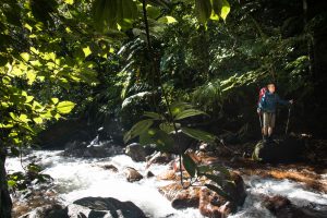 Dieser Tag ist ein typischer Regenwaldtag: Es regnet in 15 Minuten-Abständen und spätestens nach der Durchquerung des Flusses sind wir durch und durch nass. Das ist aber gar nicht so unangenehm, weil es nach wie vor warm ist und man nicht wirklich auskühlt. Wie auch die letzten beiden Tage haben wir den Track für uns alleine. Je weiter wir gehen, desto mühsamer wird der Wegverlauf. Umgestürzte Bäume machen es schwer weiterzukommen, teilweise müssen wir die Rucksäcke abnehmen und irgendwie durchklettern. Nach einer gewissen Zeit kommen wir an eine Stelle, an der wir bereits waren – wir versuchen zwar weiter, den richtigen Weg zu finden, doch an einem Punkt ist es so dicht, dass wir beschließen umzukehren und noch eine Nacht im Hängematten-Shelter von Matouba zu verbringen – so machen wir es dann auch, nach diesem etwas abenteuerlichen Ausflug in den Dschungel an diesem Tag 😊!